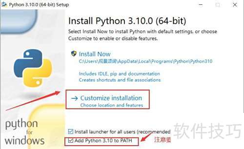 6、 务必勾选Add Python 3.10 to PATH,否则需手动设置环境变量,避免后续使用出现问题。
