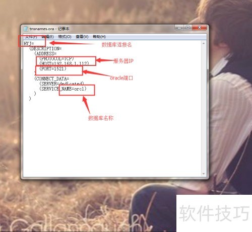 6、 使用记事本打开 tnsnames.ora 文件,添加数据库连接所需信息,包括连接名称、数据库名、Oracle 服务器 IP 地址及端口号,通常默认端口为 1521。
