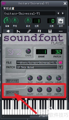6、 开启CHORUS功能后,旋转旋钮可调节声道数量、效果混合比、LFO速率及调制深度。