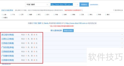4、 在关键词排名查询框中输入目标关键词与网址,选择显示结果。以门道佰分佰网站为例,填入其网址及相应关键词进行查询。