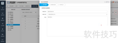 2、 进入快速开发模块,选择表单设计,点击工具栏中的新增按钮,输入表单名称并选定分类,完成创建。