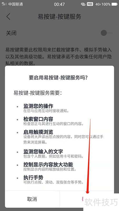 4、 在出现的提示框中点击确定,以启用易按键服务功能。