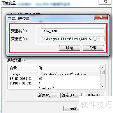 6、 在系统变量区域点击新建按钮,打开编辑系统变量窗口。在变量名输入框中填写JAVA_HOME,然后在变量值栏中输入JDK的安装路径,例如C:Program FilesJavajdk1.6.0_24。确认信息无误后,点击确定按钮,即可完成JAVA_HOME环境变量的设置操作。