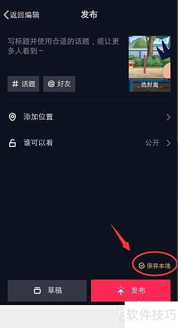 9、 完成编辑后,点击下方按钮即可将视频上传至抖音。若需保留剪辑成果,可勾选右下角选项,视频将自动存入手机相册,方便随时查看与分享。