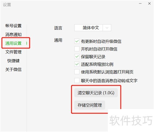 8、 3、点击左侧通用设置,在右侧选择清空聊天记录或存储空间管理。