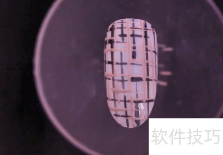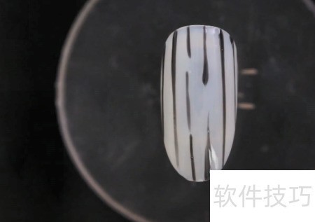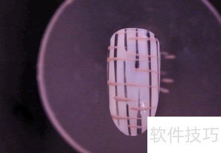 2、 用勾线笔蘸黑色甲油在指甲上绘制长短不一的纵向虚实线条,随后照灯固化。