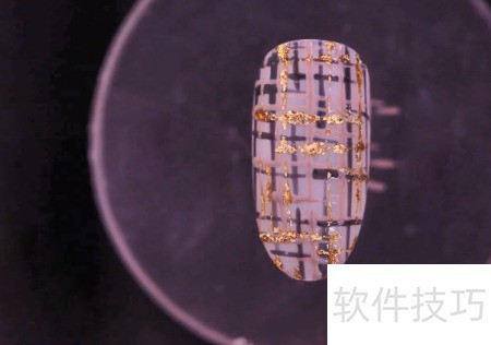 6、 用勾线笔蘸金色闪粉凝胶绘制交错线条,照灯固化后,再涂免洗封层并再次照灯固化。