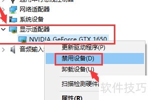 2、 在设备管理器中定位NVIDIA显卡,右键选择禁用后再重新启用即可恢复。