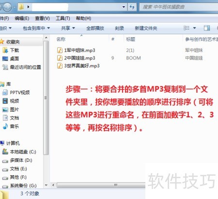 1、 将需合并的多个MP3文件放入同一文件夹,按播放顺序重命名,如添加1、2、3等数字前缀,再按文件名排序即可。