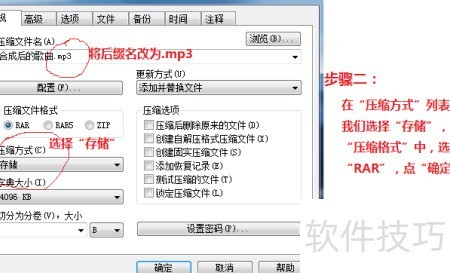 2、 按住Ctrl+A全选所有MP3文件,右键点击选择添加到压缩文件。在弹出的窗口中,进入常规选项卡,在压缩文件名栏输入名称,如喜爱歌曲联唱.MP3,务必保留.MP3扩展名。在压缩方式中选择存储模式,不进行额外压缩,确保音频数据完整。接着在压缩格式中选择RAR格式,最后点击确定开始生成压缩包。整个过程操作简单,即可将多个MP3文件合并为一个可播放的独立文件。