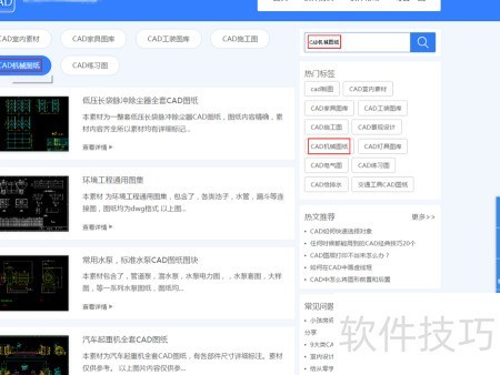 3、 在官网搜索栏输入所需CAD图纸名称,或点击热门标签中的对应类型,即可跳转至相关图纸素材集合页面,具体操作所示。