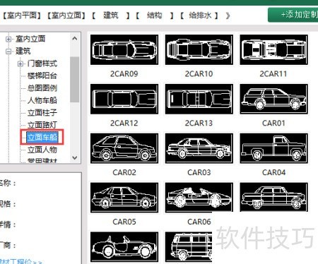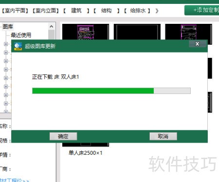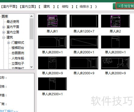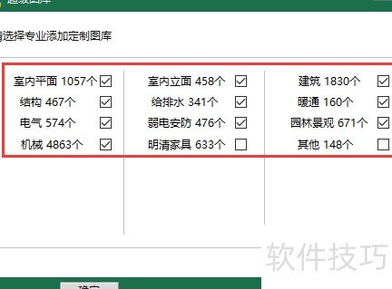 3、 点击右上角按钮,弹出图库选择窗口。根据需要勾选所需图形类型,若常用室内平面图,可仅选该类,也可全选以备后续使用,具体操作所示。