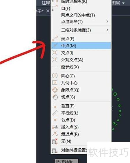 4、 点击中点,选取对象中点位置,选中后按回车或空格确认操作。
