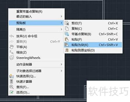 5、 返回需插入素材的图纸,右键点击选择剪切板,再选粘贴为块即可完成操作。