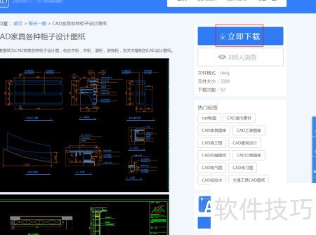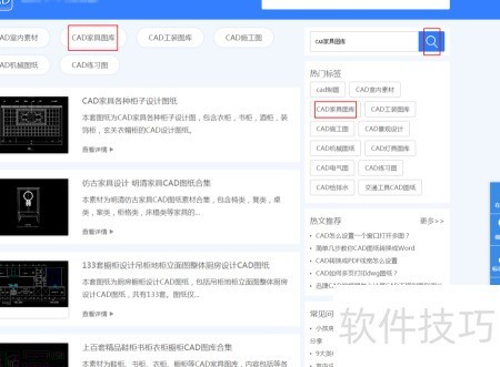 2、 第二步:根据实际需求,在页面搜索框中输入所需图纸名称,如CAD家具图库,也可直接点击官网首页的CAD家具图库分类标签,系统将自动显示相关家具设计图纸资源,供用户浏览和选取。