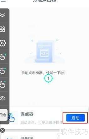 3、 返回首页后点击连点器的启动按钮即可使用,启动后屏幕左侧将显示对应的操作控制图标。
