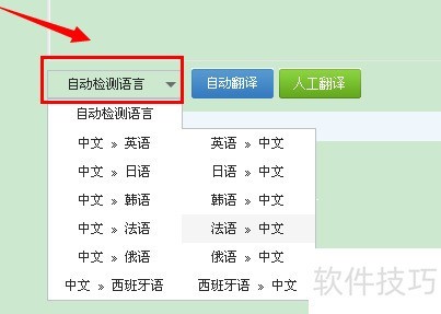 6、 点击自动检测语言可设定源语言与目标语言,选择后有助于提升翻译效率。