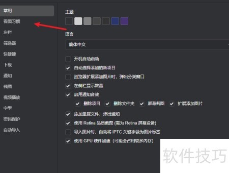 3、 进入设置页面,选择左侧箭头指示的看图习惯选项,即可进入相关设置界面进行调整。