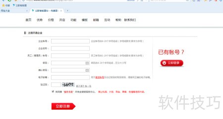 2、 进入注册页面后,按提示填写信息。企业账号需以字母开头,由字母和数字组成;员工账号与密码可设为易记的数字组合;邮箱应填写常用地址,便于日后找回或修改密码。