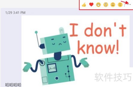 8、 将鼠标悬停在发送内容上,右上角会显示表情图标,点击最右侧的英文省略号即可。