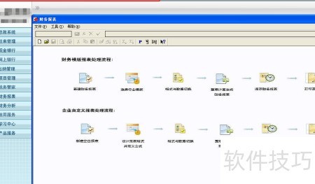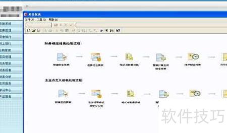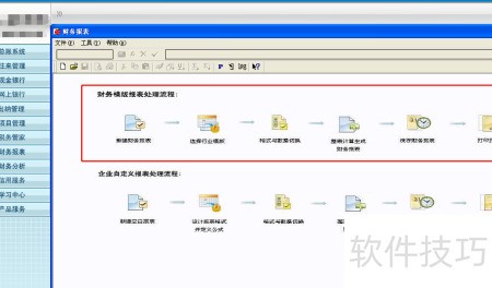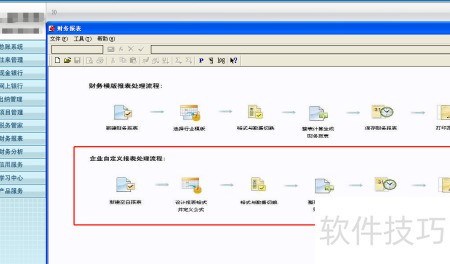 5、 第四行展示企业自定义报表处理流程:新建空白表,设定格式并定义公式,切换格式与数据,整表计算生成财务报表,最后完成保存与打印。