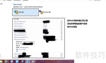1、 在控制面板中打开凭据管理器,即可在Web凭据列表中查看已保存的各网站用户名和密码信息。