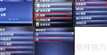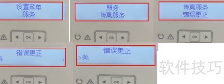 16、 进入面板设置菜单,选择服务中的传真功能,将错误更正选项由默认开启状态改为关闭,有助于提高传真信号的稳定性,设置完成后可重新尝试发送传真。