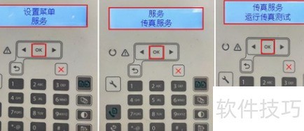 3、 进入设置菜单,选择服务中的传真功能,运行测试并打印报告,检查是否存在未通过项目。