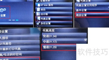 15、 在设置菜单的传真设置中,进入高级设置可调整传真速度,提供三档选项,默认为中速。建议选择慢速,虽然接收较慢,但信号更稳定。