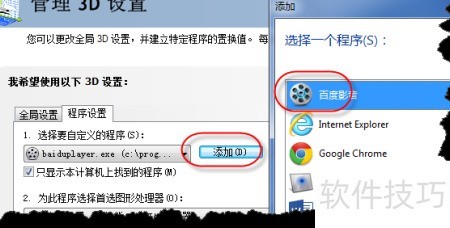 3、 进入管理3D设置,切换至程序设置选项卡,点击添加按钮,在弹出窗口中选择百度影音进行配置。