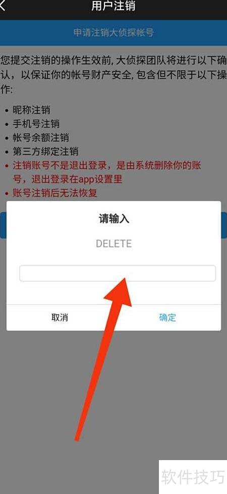 6、 弹出确认窗口后,在输入框中键入DELETE完成注销操作。