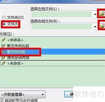 2、 打开Beyond Compare软件,选择文件菜单中的新文件比较功能。在弹出的对话框中,可通过点击选择左侧文件和选择右侧文件后的文件夹图标来指定需对比的文件。也可先点击确定,再将需要比较的两个文件分别拖拽至软件界面左右两侧的指定区域,即可开始文件内容对比,操作简便直观,便于快速查看差异。