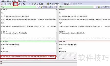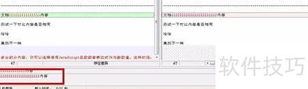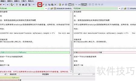 3、 左上角红框内的红色区域显示两侧文件的差异,点击红线可快速定位。通过工具栏的上下箭头也能便捷跳转至不同差异处。对比框中以红色字体标出具体内容差异,便于直观查看和核对两份文件的不同之处。