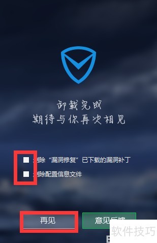7、 卸载时可选择清除配置文件及漏洞补丁,确认后点击再见即可完成电脑管家的卸载操作。