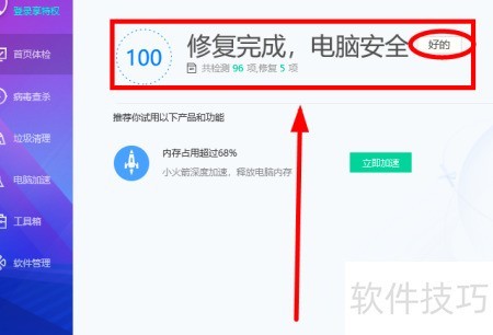 6、 电脑修复完成后将显示新评分,若对结果满意,请点击以结束本次体检与修复操作。