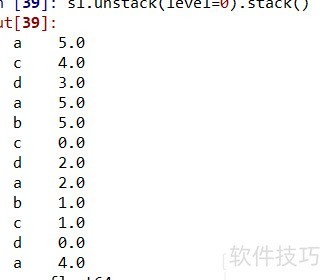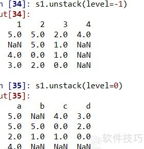 10、 s1.unstack(level=-1)表示将最内层索引转为列,s1.unstack(level=0)则是将最外层索引转为列;unstack的逆操作是stack,具体转换过程所示。
