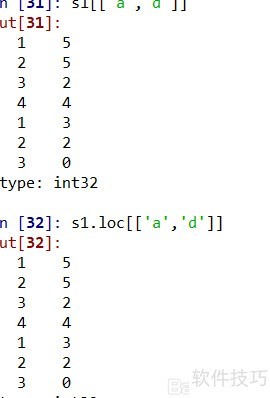 7、 当外层两个索引不连续时,可通过s1或s1.loc方法提取外层索引为a和d的数据,具体操作所示。