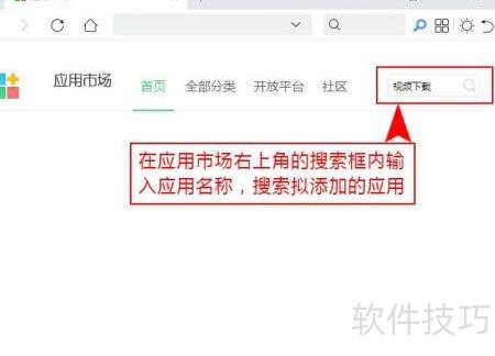 5、 在应用市场右上角搜索框输入应用名,查找并添加所需应用。