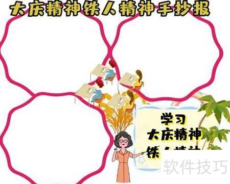 5、 在边框连接处描绘我们专注听讲的画面,下方呈现老师授课的情景,侧旁书写学习大庆精神、铁人精神字样。