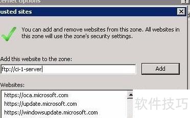 4、 打开IE浏览器,进入安全设置,将需访问的FTP站点添加至信任站点列表。