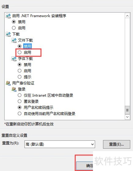 5、 在安全设置界面中找到下载选项,将文件下载设为启用,保存设置即可。对于Windows Server 2012或2008系统,必须开启此功能才能在局域网中进行文件下载,这是系统出于安全策略所做的设计,确保网络操作符合安全管理要求。