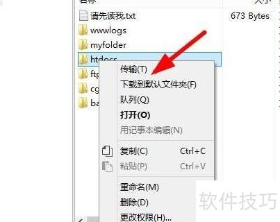 4、 下载服务器文件至本地时,可在右侧选中文件后右键选择传输功能完成操作。