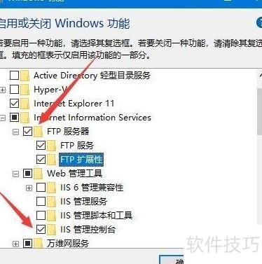 4、 此时将弹出Windows功能窗口,需勾选FTP服务器,并确认选中Web管理工具下的IIS管理控制台,完成后点击确定即可。