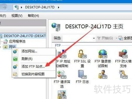 6、 在IIS管理器中,右键单击网站,从菜单中选择添加FTP站点选项。