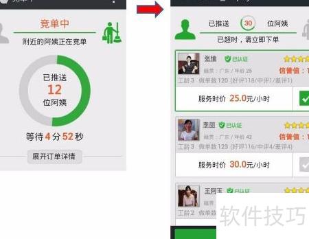 3、 发单成功后,系统将向用户附近的帮姐推送信息,待帮姐报价,用户可选择合适人选预约下单。