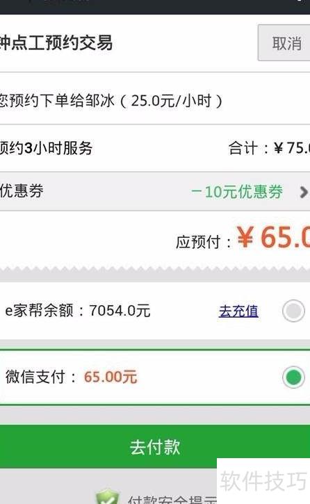 4、 预约成功后将进入预支付页面,可选择微信支付或e家帮余额支付,优惠券亦可在该页面使用。