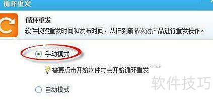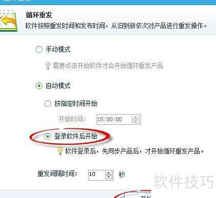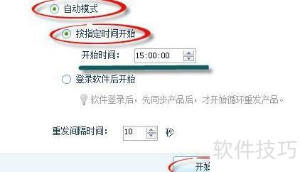 8、 开启自动模式后,选择定时启动功能,设置期望的开始时间并确认,系统将在指定时刻自动执行商品循环重发操作,无需人工干预即可按时运行。