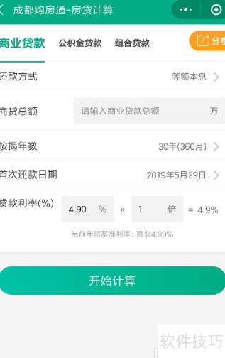 3、 打开房贷计算器,选择商业贷款、公积金贷款或组合贷款类型,输入贷款金额、期限等个人信息,即可计算相关还款数据。