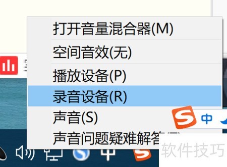 1、 右键点击任务栏音量图标,选择录音设备即可进入设置界面。