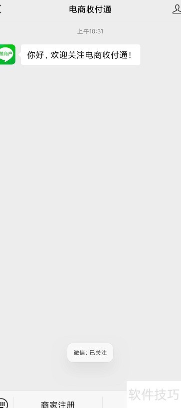 4、 关注后页面将自动跳转至电商收付通首页,即可注册并开始使用。